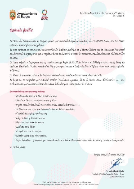 Se trata de un bono de 22€ que se entregará a los niños y niñas que cumplieron 8 años en 2019. La edad no es ninguna casualidad, ya que han aclarado que a esta edad un niño tiene la madurez intelectual suficiente para leer libros más sofisticados, con un texto más desarrollado y amplio. Marañón ha afirmado que «es una bienvenida que quiere dar la ciudad a los niños de Burgos al mundo de la lectura». Los bonos podrán canjearse en cualquier librería perteneciente a la Asociación de Libreros hasta el 21 de febrero.