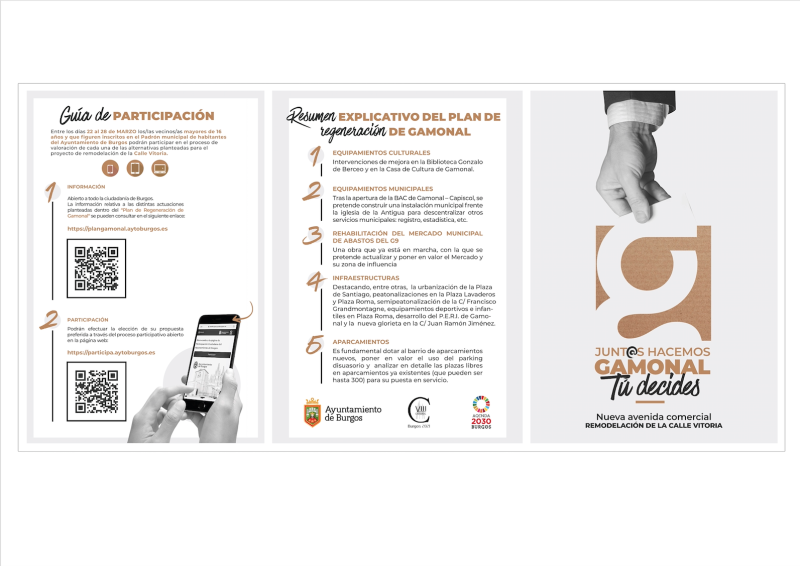 El concejal de Participación Ciudadana, Adolfo Díez, ha explicado los detalles de este proceso participativo, cuyo objetivo es la difusión entre la ciudadanía y especialmente en la población que reside en Gamonal de las actuaciones de intervención urbanísticas que pretende llevar a cabo el Ayuntamiento de Burgos dentro del plan de regeneración de Gamonal. Se pretende también invitar a la participación para conocer la preferencia de los vecinos de las tres opciones de actuación que se pretenden en la calle Vitoria.
