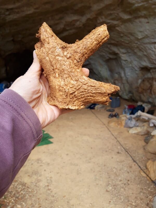 Durante la campaña de excavación de este mes de agosto los trabajos se han centrado en una zona nueva de la cueva denominada «sector hornacina». En total se han excavado 22 metros cuadrados pertenecientes al nivel 4. Este nivel tiene una cronología de 46.000 años y durante esta verano se han recuperado más de 2.000 restos, predominando los fósiles de animales sobre las herramientas de piedra y los fragmentos de carbones. Los animales más representativos en este sector han sido los ciervos (Cervus elaphus) y jabalíes (Sus scrofa), seguidos de caballos (Equus ferus), rebecos, (Rupicapra Rupicabra) y corzos (Capreolus capreolus). Los huesos aparecen fragmentados destacando los pertenecientes a las extremidades y en menor medida costillas, dientes y otros restos del esqueleto craneal. Destaca el hallazgo de un par de astas y cuatro candiles de ciervo, así como la presencia de varios falanges completas. A diferencia de otros lugares de la cueva excavados previamente, los fragmentos del sector hornacina presentan un mayor tamaño.