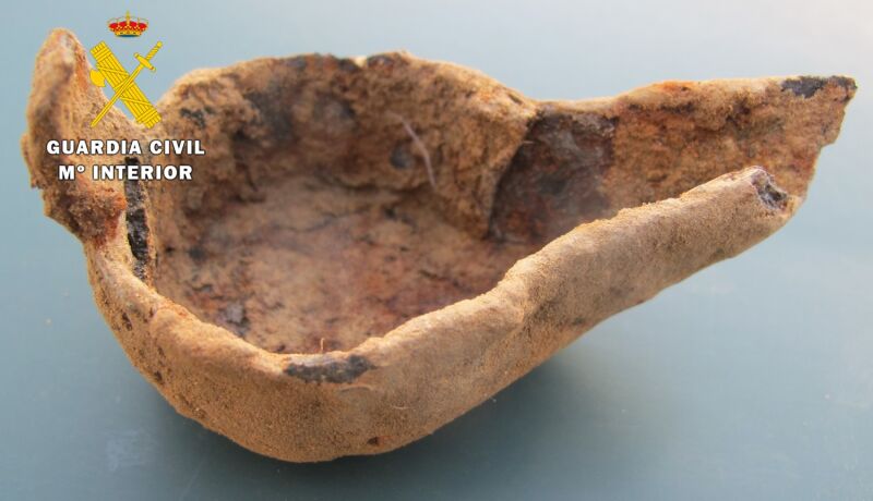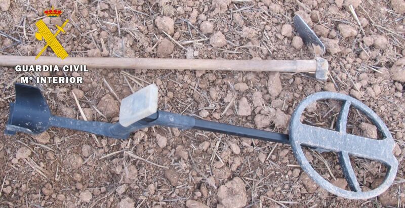Fue sorprendido in fraganti hoyando el terreno con una azada y ayudado de un detector de metales en funcionamiento. Realizaba prospecciones arqueológicas sin autorización y obvió la comunicación del primer «hallazgo» a la Administración. Se han incautado 9 monedas, un botón, un candil y varios fragmentos de plata, cobre y otros metales de notoria antigüedad