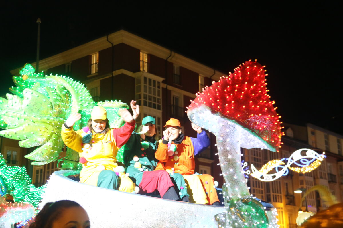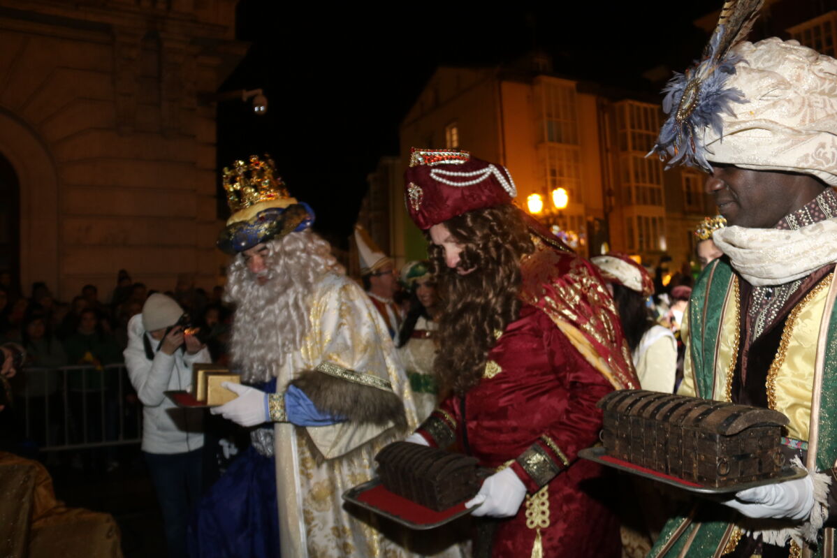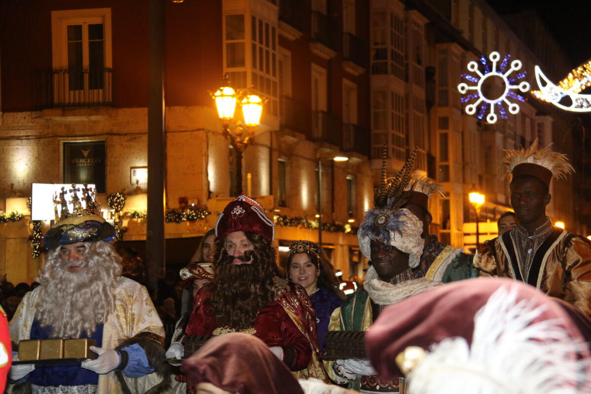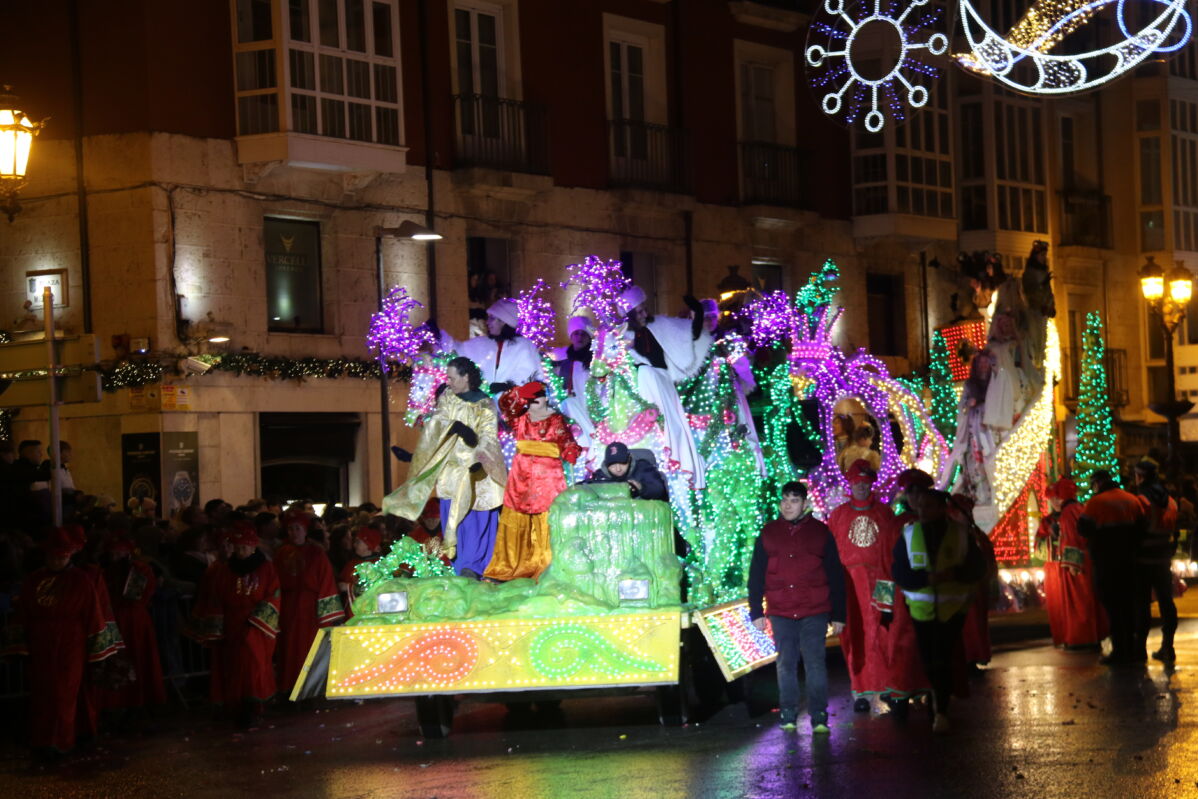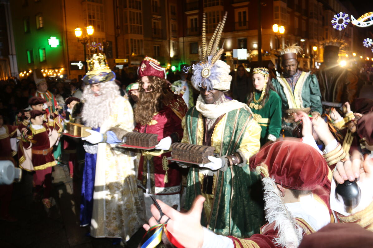En el trayecto, los Magos y sus pajes repartieron los 4.000 kilos de caramelos sin gluten entre los asistentes. Al llegar a la Plaza de Mío Cid se apearon de sus carrozas para saludar a los niños que allí se congregaron. Después, pasaron a adorar al Niño que se encontraba en el portal con María y José.