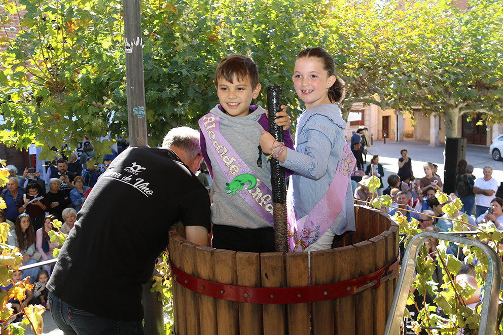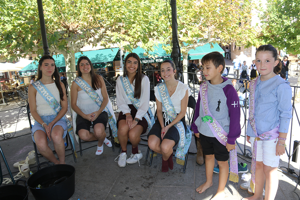 La corte de honor de las fiestas de Lerma, comenzando por el alcalde y la alcaldesa infantiles, eran los encargados de pisar la uva y extraer ese primer mosto que pudieron degustar los asistentes.
