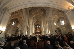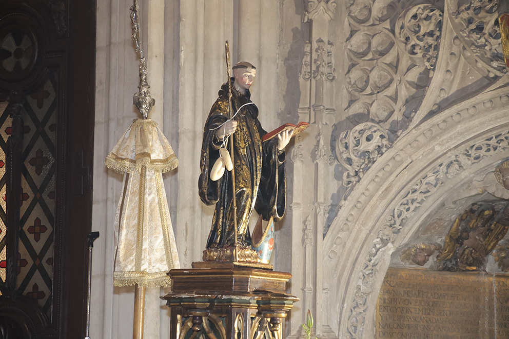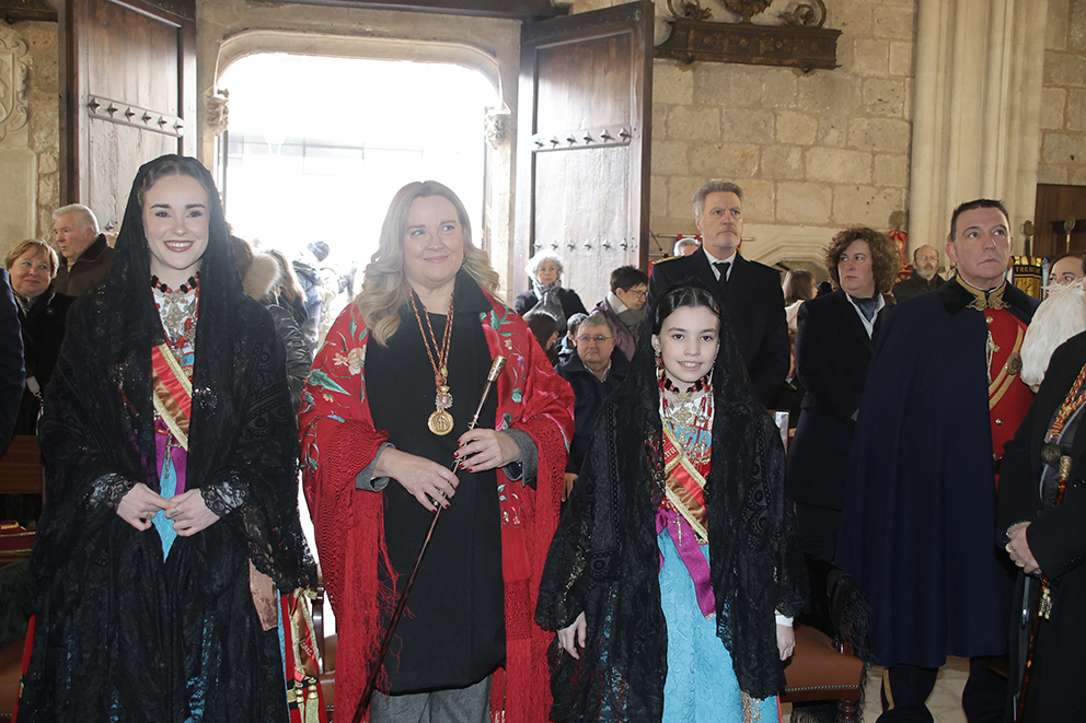 Autoridades civiles y militares asistían a la misa, junto con miembros de las peñas y cofradías que llenaban la iglesia en la que cada año se renueva el voto de la ciudad con el santo y que se representa con el gran cirio con el escudo de Burgos que la alcaldesa entregaba al arzobispo emérito, Fidel Herráez, y que estará encendido junto a la tumba del santo.