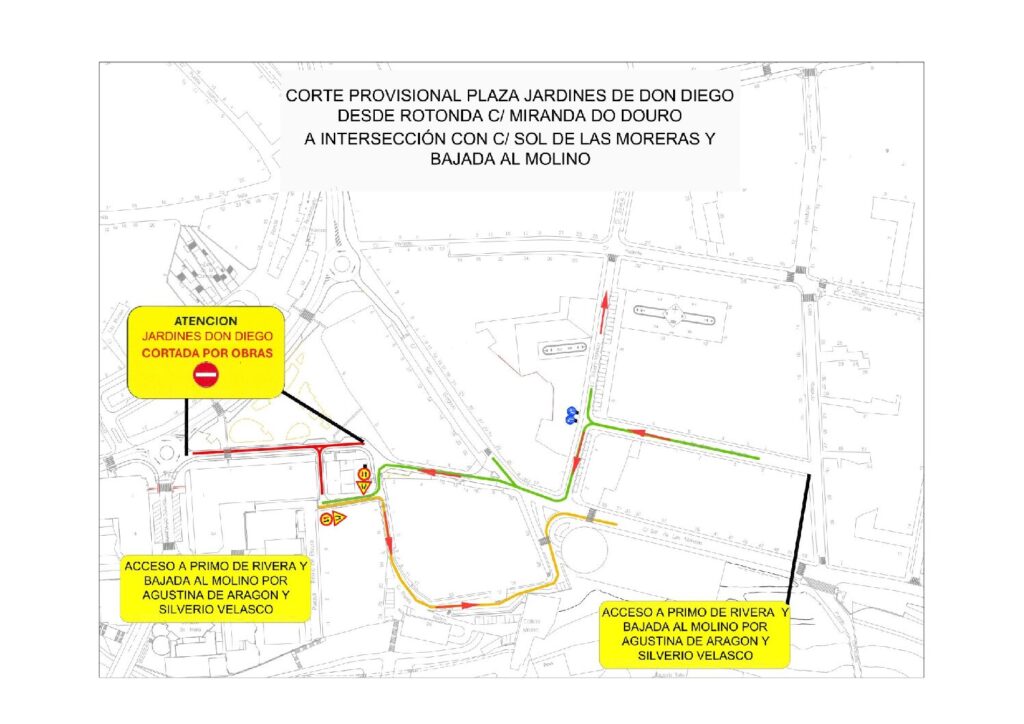 El Ayuntamiento de Aranda de Duero informa de que el próximo miércoles 25 de marzo, entre las 08:00 y las 20:00 horas, se llevará a cabo el corte temporal del acceso rodado a la plaza Jardines de Don Diego, desde la rotonda de la calle Miranda do Douro hasta la intersección con las calles Sol de las Moreras y Bajada al Molino, así como el Pasaje Primo de Rivera, de acuerdo con el plano técnico municipal.