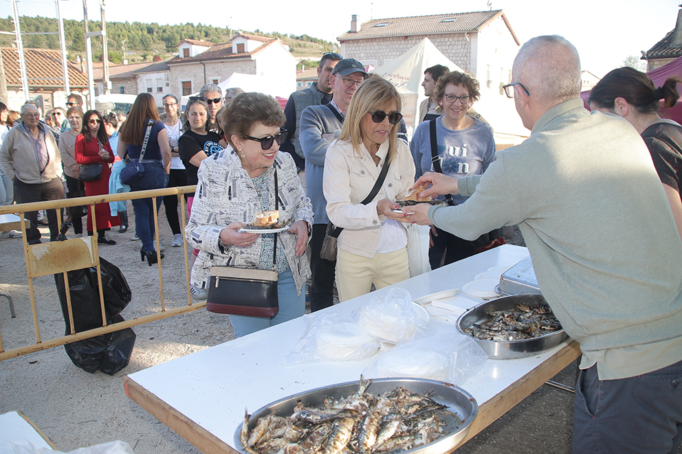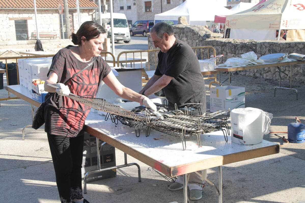 Pero era el sábado, cuando los puestos abrían sus puertas ofreciendo dulces, embutidos, vinos, bebidas, artesanía, morcillas o quesos, productos variados que hicieron las delicias de los visitantes. A las 11:00 de la mañana, se abría oficialmente la feria, amenizada por la Charanga Papamoscas, que llenaba de música y ambiente festivo las calles del municipio. Ya por la tarde, a las 18:00, tenía lugar uno de los momentos más esperados: la gran sardinada popular en la Plaza Mayor, 100 kilos de sardinas asadas por las manos expertas de un cocinero de Suances, que hizo que la cola se mantuviera durante unas horas. Además, se procedió al sorteo de productos donados por los expositores, y el homenaje a uno de los máximos colaboradores de esta feria a lo largo de los años, José Antonio Morante, presidente de la Asociación Costa Central Altamira. Esta asociación participa activamente en esta feria, y son muchos los expositores pertenecientes a la ACCA que cada año vienen a Castrillo del Val a esta feria. Otro de los homenajeados fue Pascal Modet, propietario Château Melin y Château Constantin y alcalde de Baurech en la zona vinícola de Burdeos.